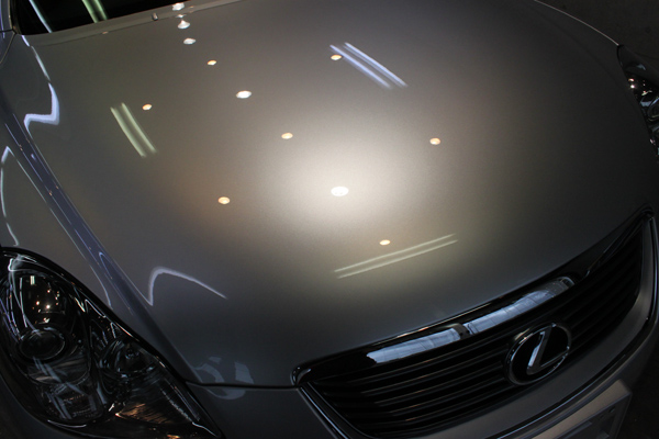 最新の強力LEDを追加し一段とグレードアップした高輝度専用照明によって、通常では気付かないような細かな傷も見逃すことなくしっかりと処理しながら下地処理を進めていきますと、本来のプレミアムシルバーが姿を現し、レクサスの高品位塗装の素晴らしさがいっそう実感できる塗装面となりました。