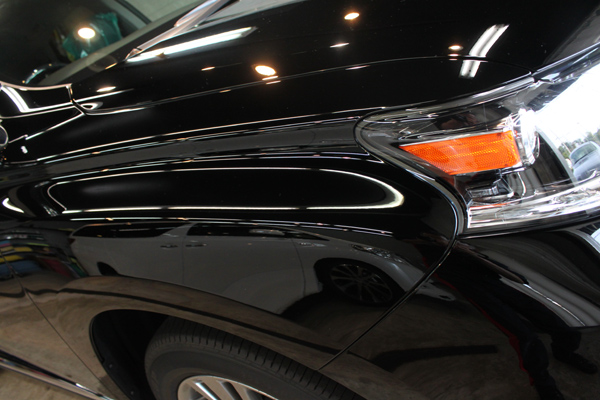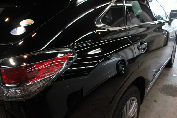 こちらのRX450hは、施工者の技量が明確に現れるソリッドブラック(212)ですが、塗装の特性を知り尽くした最良の下地処理を行うことによって、プレスラインも曲面もしっかりと現れ、ボディーの造形の美しさが一段と引き立つ仕上がりとなりました。