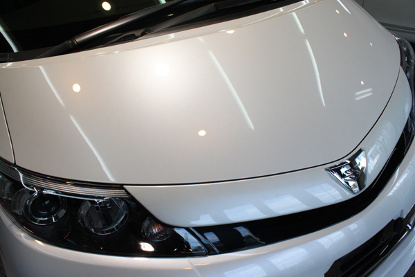 さて、こちらのエスティマのカラーは、トヨタが誇るホワイトパールクリスタルシャイン(070)です。ホワイトパールクリスタルシャインは、定評のあるトヨタの塗装の中でも特に素晴らしいカラーで、色むらの無いきめ細かなパールの粒子の美しさには、本当に目を見張るものがあります。お手入れもしやすいこのカラーは、洗車に手間がかかりやすいミニバン系のお車には特にお勧めで、私がトヨタのミニバンを買うとしたら間違いなくこのカラーを選びます。
