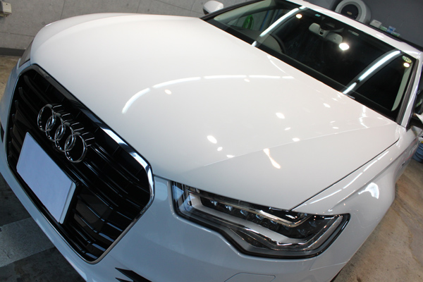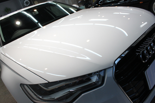 さて、こちらW様のA6ハイブリッド、輸入車にありがちな修正痕もなく傷も少なめで状態は良好でした。しかし、グレイシアホワイトメタリックというこのカラー、塗装が曇ってすっきりしない感じで、いつものアウディの塗装と比べると今一つといったところでした。