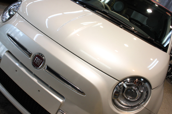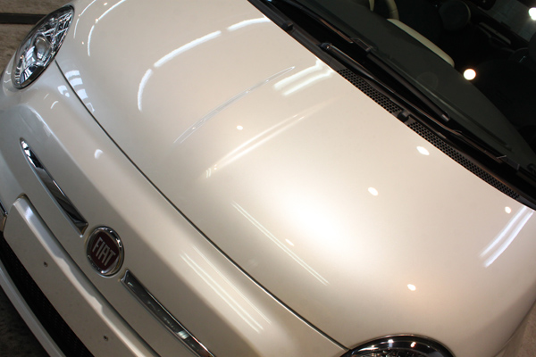 お車のカラーは、ファンクホワイトというパールホワイトです。洗車の後、こびりついた鉄粉、ピッチをさっぱり取り去り、下地処理では、納車前に磨かれたバフ傷も見られましたが、これもきれいに修正していねいに肌理を整えます。コーティング被膜には、もちろんリボルト・プロ。透明感と被膜感たっぷりの仕上がりとなりました。ファンクホワイトというパールホワイトは、かなりパールが利いていますが、リボルト・プロによってさらに塗装の品位が上がったと思います。