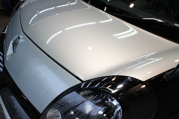 下地処理を終えた後は、ラディアスオリジナルの硬化型ガラス被膜であるリボルト・プロを定着させます。施工場の温度と湿度をチェックし、被膜の硬化速度に気を配りながら被膜を形成いたしますと、光沢とともにパネルの形状がすっきりと浮かび上がり、リボルト・プロならではの深く透明な美しい仕上がりとなりました。
