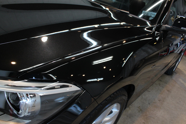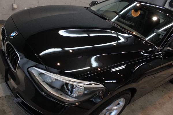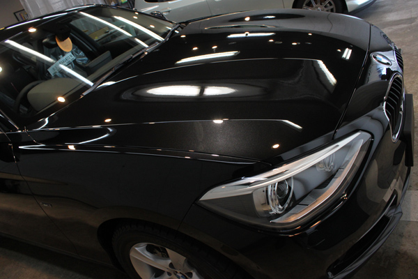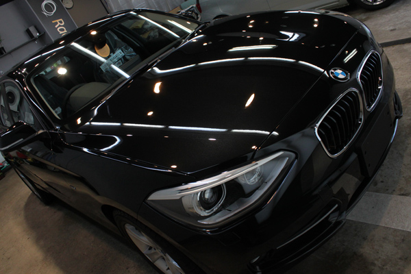 下地処理で塗装そのものの美しさを引き出した後、リボルト・プロの硬化型ガラス被膜を塗装面に密着形成させますと、プレスラインとパネル構成が絶妙な116iの造形がクッキリと浮かび上がりました。
